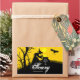 Une méchante sorcière et son chaudron, une chauve-souris noire, une clôture de piquetage et la silhouette d'arbre nu contre un ciel éffrayant ces autocollants de fête d'Halloween. Les mots "Mangez, Buvez et Soyez effrayants" sont affichés et votre nom ou laissez cette section vide. CORRESPONDANCE d'objets dans notre collection.