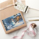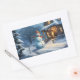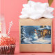 Un tableau d'hiver agréable, coloré, d'un bonhomme de neige devant une maison.