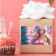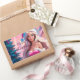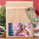 Belle illustration d'une belle fille en robe rose et casquette du Père Noël avec boîte cadeau près du sapin de Noël. Choisissez cette adorable fille dans les suites père Noël entourée de l'atmosphère magique de Christimas pour célébrer vos vacances avec joie et une touche de magie. Parfait également pour les cartes de voeux.