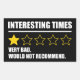Temps Intéressants - Très Mauvais. Ne Recommanderait Pas. Cet accessoire de citation drôle et sarcastique est parfait pour les hommes et les femmes qui donneraient à cette décennie une note d'une étoile. Face à des temps difficiles avec humour et sarcasme. Une malédiction chinoise dit, "Puissiez-vous vivre dans des temps intéressants", et beaucoup seraient d'accord cette fois dans l'histoire pour cette description. Avec la guerre, la polarisation politique et le changement climatique, ce sont des temps difficiles en effet !