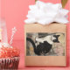 Aquarelle illustrant le chat noir et blanc assis sur un rocher dans le jardin.