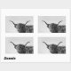 Autocollant photo rectangulaire avec une vache écossaise robuste mais drôle avec de grandes cornes, de longs poils devant les yeux et la bouche mi ouverte en noir et blanc / monochrome.