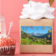Autocollant photo rectangulaire du village de St. Magdalena ou Père Noël Maddalena avec l'église caractéristique devant les sommets de Geisler ou Odle Dolomites dans la vallée de Val di Funes (Villnoesstal) en Italie en automne entouré de feuilles d'automne.