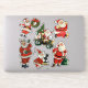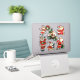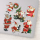 These are a collection of vintage-style die-cut Christmas stickers featuring various depictions of Santa Claus. The six distinct designs show Santa in different poses and situations, including one holding a wreath, another running, one driving an old-fashioned car with a Christmas tree and gifts, one waving cheerfully, one holding a small black poodle on a pillow while wearing an elf-like hat, and a final one standing with a large green sack of toys. All the Santas are dressed in their classic red and white fur-trimmed suits, giving the set a charming, nostalgic holiday look.