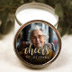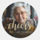 These custom 100th birthday stickers feature the guest of honor's photo, along with the word "Cheers" in elegant gold-colored calligraphy script. A dark screen helps make the text pop. A great way to celebrate someone who's turning a hundred!