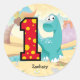 Célébrez le premier anniversaire de votre enfant avec ce mignon petit dinosaure. Joyeux 1er anniversaire ! Personnalisez cet autocollant avec le nom de votre enfant. Des tasses, des assiettes et des sacs-cadeaux assortis sont également disponibles.