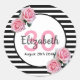 Un autocollant pour une fête du 30e anniversaire. Classic rayures noir et blanc mince comme arrière - plan. Avec des roses roses roses roses girly et féminine comme décoration. Un cadre sur le devant avec modèle pour l'âge, le nom et la date. Numéro d'âge en rose, nom et date en noir. Le nom est écrit avec un script de style écrit à la main.