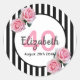 Un autocollant pour une fête du 40e anniversaire. Classic mince bandes verticales noir et blanc comme arrière - plan. Avec des roses roses roses roses girly et féminine comme décoration. Un cadre blanc sur le devant avec modèle pour l'âge, le nom et la date. Numéro d'âge en rose, nom et date en noir. Le nom est écrit avec un script de style écrit à la main.