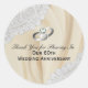 Laissez à vos invités un message de remerciement élégant sur ces autocollants de faveur. Fabriqué avec des garnitures en dentelle blanche sur les côtés supérieur gauche et inférieur droit. Arrière - plan blanc cassé, faux satiné en dessous. Texte personnalisable en noir. Bandes d'anneau en argent Faux (une avec un faux diamant) au-dessus du texte.