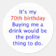 "C'est mon 70e anniversaire, m'acheter un verre serait la chose polie à faire." Un design humoristique pour cet enfant de 70 ans qui aime faire rire les gens et si une boisson gratuite sort de l'affaire, qu'il en soit ainsi.