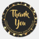 Étiquettes de remerciement personnalisées avec des étoiles noires et dorées modernes pour un anniversaire, personnalisées avec votre texte personnalisé et un "MERCI" manuscrit au centre. Utilisez-les comme papeterie d'anniversaire, sceaux d'enveloppe ou autocollants de remerciement pour une fête d'anniversaire. MODIFICATIONS : Vous pouvez modifier la couleur de fond ou le style de police, la taille, la couleur ou l'emplacement du texte en cliquant sur PERSONNALISER DAVANTAGE. Contactez le designer via Zazzle Chat ou makeitaboutyoustore@gmail.com si vous souhaitez que ce design soit modifié, sur un autre produit ou si vous souhaitez des articles coordonnés.