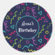Retournez aux années 80 et 90 avec autocollant rond fête d'anniversaire personnalisé avec confettis et abstraits formes rétro motif conçu dans le style Memphis en rouge, jaune, bleu et vert sur arrière - plan bleu foncé. Vous pouvez modifier le nom de la conception à l'aide du bouton Personnaliser