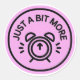 This image is a circular badge design set against a solid light pink background with a thick black border.