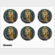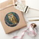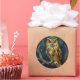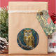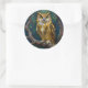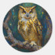 A beautiful sticker with a gold and blue owl sitting on a tree branch. This illustration has an impasto oil painting style.