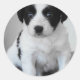 Photo portrait mignon d'un chiot noir et blanc assis avec obéissance pour la caméra.