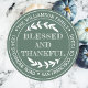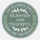 Autocollant d'adresse de retour ronde de remerciement avec votre nom et adresse en typographie blanche stylisée avec le texte BÉNI ET RECONNAISSANT en typographie manuscrite avec une touche stylisée de feuillage rustique sur fond vert. Également idéal pour un remerciement professionnel à vos clients ! Ajoutez simplement le nom et l'adresse de votre entreprise ou votre site web. Conçu exclusivement pour vous par Happy Dolphin Studio.