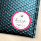 Cet autocollant Laisser un commentaire a les mots "Merci" dans le script de calligraphie et étoiles en noir contre un centre rond blanc et une couleur de bordure modifiable (cliquez sur "personnaliser" et changer la couleur arrière - plan afin de changer la couleur de bordure). Personnalisez-le en remplaçant les textes de l'espace réservé et l'image de l'espace réservé par votre propre logo. Pour plus d'options comme changer la police, espacement entre les lettres et pour développer ou contracter du texte courbe cliquez sur le bouton "Personnaliser". *Veuillez noter que le filigrane Zazzle qui apparaît dans l'aperçu du zoom n'apparaîtra PAS sur le produit imprimé final. © Bois de rose et agrumes