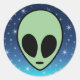 Une tête alien verte avec de grands yeux noirs ovales et une petite fente noire pour une bouche. L'arrière - plan est un dégradé foncé à bleu clair, parsemé d'étoiles blanches.