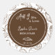 These All I Sea Is Love Brown Seashells Doodles Classic Round Stickers highlight a warm brown background covered in whimsical seashell, starfish, heart, and sparkle doodles, giving your bridal celebration a rustic coastal charm. A solid brown circle with a thin white inner outline sits at the center, containing your customizable details. Inside, the text “All I Sea Is Love” appears at the top, followed by space for the bride’s name, “Bridal Shower,” a small seashell illustration, and the date of the celebration. Perfect for favor packaging, envelopes, gifts, and party décor, all text and colors can be edited to coordinate with your event.