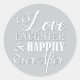 Cet élégant autocollant de mariage comporte l'expression typographiquement "To Love, Laughter, and Happily Ever After"