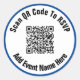Vous pouvez remplacer l'image d'affichage par votre code QR. Il existe deux lignes de texte d'affichage noir que vous pouvez modifier pour afficher un message personnalisé. (Montré : Scan QR Code To RSVP) Ces autocollants ont du texte noir dans un cercle blanc. L'autocollant a une bordure bleue profonde.