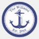 Ce design nautique est doté d'une ancre bleu marine avec une bordure de corde circulaire et un bord bleu marine. Personnalisez avec votre nom de famille et votre année d'établissement, ou remplacez par d'autres textes.