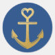 Ancre en feuille dorée avec un cœur en haut sur un autocollant simple parfait pour les sceaux d'invitation de mariage nautique ou de croisière ou les étiquettes de faveur. Cliquez sur PERSONNALISER PLUS pour changer la couleur de fond pour coordonner avec votre célébration, ou pour ajouter du texte.
