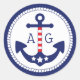 Ces autocollants patriotiques d'inspiration nautique ont une ancre rouge, blanche et bleue avec des étoiles et des rayures sur un cercle blanc avec un bord de corde et une frontière bleu marine. Deux initiales Monogram sont de chaque côté de l'ancre pour vous permettre de personnaliser.
