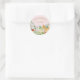 "Autocollant rond classique d'animaux de la forêt de bois Cerf Renard Hibou Feuillage Rose" Fond rose blush pastel doux (vous pouvez changer la couleur si vous le souhaitez) avec une forêt adorable, des animaux de la forêt d'un cerf, d'un hibou, d'un hérisson et d'un lapin garni sont dans un cadre boisé peint à l'aquarelle avec des fougères et une verdure feuillue ainsi que des champignons rouges et blancs à pois. Tous les champs de texte peuvent être personnalisés. Œuvre d'art de l'artiste Audrey Jeanne Roberts, connue et licenciée à l'international, copyright.