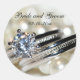Customisez les élégants Stickers Enveloppe Mariage Anneaux et Perles Blanches avec le nom personnel de la date de la mariée et du marié et la cérémonie de mariage. Cet autocollant nuptial personnalisé classe présente une photo de près d'un anneau fiançailles en diamant et une bande mariage sertie d'un collier de perle blanche.