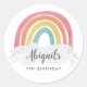 Colorful Rainbow Calligraphy Anniversaire de enfant collant rond présentent un arc-en-ciel dessiné à la main dans les tons rose, orange, jaune et turquoise et un nom de calligraphie tendance.