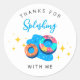 Anniversaire de enfant de piscine Classic Round Sticke Cute Pool thème de fête d'anniversaire garçon autocollant de faveur avec aquarelle illustration d'un pool quelques étoiles jaunes autour. Le texte dit "merci de m'avoir éclaboussé".