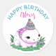 Les autocollants d'anniversaire de fille rose, violet et bleu axolotl. Ajoutez simplement un nom dans la zone personnalisée.