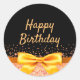 Un autocollant pour une fête d'anniversaire girly et glamour. Un élégant arrière - plan noir avec un élégant faux arc en or. Le texte : Joyeux Anniversaire est écrit avec un script de style manuscrit moderne doré.