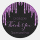 Un élégant arrière - plan noir classique décoré avec des gouttes de parties scintillant couleur violet foncé, un look dégoulinant de peinture et une petite rose rose rose. Avec le texte : Merci! écrit avec un script de style à la main moderne. Personnalisez et ajoutez une date et un nom. Lettres violettes. Parfait pour les faveurs de fête ou les cartes de remerciements.