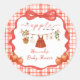 Add the perfect finishing touch to your baby shower favors and décor with this adorable “Apple of Our Eye” baby shower sticker. Featuring a red gingham plaid background, a scalloped white frame, and a charming red bow, this round sticker beautifully captures the rustic elegance of a fall or autumn baby shower.
