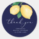 Une faveur vive et fraîche merci autocollant parfait pour une douche nuptiale ou tout autre événement. Dispose de 2 citrons aquarelle avec feuilles verts, sur un arrière - plan bleu marine avec "merci" en blanc de style calligraphie moderne. Personnalisez avec les détails de l'événement.