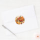 Cet autocollant animé et festif de Thanksgiving comprend deux citrouilles moelleux au centre, entourés d'un ensemble de feuilles d'automne aux teintes chaudes de rouge, orange, jaune et marron. Les feuilles ont une délicate texture aquarelle, ajoutant un charme artistique au design. Le message de bienvenue "Bon thanksgiving !" est écrit avec élégance en écriture cursive, qui traverse magnifiquement les citrouilles. Le texte se distingue en noir, ce qui le rend facilement perceptible par rapport à l'arrière - plan coloré. Cet autocollant saisit parfaitement l'essence de Thanksgiving avec son accent sur la récolte et la gratitude. De plus, le texte est entièrement personnalisable, vous permettant de le personnaliser selon vos préférences ou des occasions spécifiques. Idéal pour ajouter une touche spéciale à vos décorations de vacances !