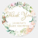 Sweet été rose or script baby shower merci, autocollant rond classique. Conçu pour coordonner avec notre collection de baby showers en or rose Sweet été. Un élégant design floral avec du texte doré que vous pouvez personnaliser avec votre nom, encadré par une guirlande de roses d'été sucrés. Idéal pour sceller les enveloppes d'invitation ou les faveurs de fête.