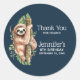 Anniversaire merci autocollants avec un design d'aquarelle mignon avec un paresseux mignon accroché à une branche d'arbre entourée de feuilles tropicaux verts. Arrière - plan bleu foncé.