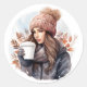 Sticker Rond Aquarelle mode hiver fille avec café