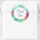 stickers Merci avec un design abstrait cool et élégant. Les aquarelles se mélangent pour créer l'illusion d'une image spatiale. Vert avec des tourbillons de violet, jaune et rouge clair se mélangent avec un peu de points et d'étoiles blancs. Une élégante création artistique. Un cercle blanc superposé avec votre texte à l'intérieur.