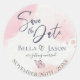 Mignonne Aquarelle Rose Butterfly Wedding Enregistrer La Date Classic Round Sticker. Le design a un arrière - plan d'aquarelle rose avec un papillon mignon et de l'espace pour ajouter les noms du couple et la date mariage. Ce mignon autocollant peut être facilement customisé en changeant les noms et la date. Pour toute personnalisation supplémentaire, n'hésitez pas à me contacter à l'adresse mypaperlove2021@gmail.com