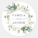 Cet autocollant mariage présente des eucalyptus à aquarelle peinte, des feuilles verts, des fleurs avec un cadre hexagone géométrique en faux or. Pour une personnalisation plus avancée de cette conception, cliquez sur le lien "Customiser plus loin". Des articles correspondants sont également disponibles.