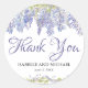 Belle glycine violette et bleue drapés sur le dessus de ce mariage floral merci sticker. Le Merci est écrit dans une police de caractères large et fantaisiste. Le nom du couple mariage et la date du mariage suivent ci-dessous dans une police simple et chic. Une simple vigne à glycine et quelques fleurs créent la bordure inférieure.