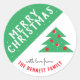 Arbre de Noël vert avec flocons de neige Sticker de Noël avec un nom de famille. Autocollant de Noël amusant avec Joyeux Noël et un nom de famille - personnalisez l'autocollant. Couleurs festives en vert, rouge et blanc, un arbre de Noël simple et des flocons de neige. Grand autocollant de Noël pour votre envoi de Noël ou un autocollant d'emballage cadeau.