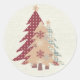 Ces autocollants rustiques de campagne ou sceaux d'enveloppe ont trois arbres de Noël ou de vacances dans des couleurs atténuées de plaid bordeaux, beige et vert avec des flocons de neige et des pois sur deux des arbres qui ont également des étoiles dorées sur le dessus. Le fond est une toile de lin léger.