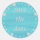 La peinture d'un cercle d'étoiles d'argent sur un arrière - plan de blues clairs mélangés avec Save the date, en argent, est imprimée sur des autocollants.