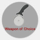 Feuille d'autocollants "Arme de choix" avec découpe à pizza et texte sur un arrière - plan gris.