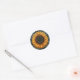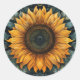 Une représentation artistique d'un grand tournesol avec des pétales détaillés sur un arrière - plan foncé décoratif rempli de feuilles.